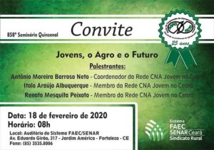 Na próxima terça- feira, 18 , a partir das 8 horas, no auditório do Sistema FAEC/SENAR-CE, na Avenida Eduardo Girāo 363, realiza-se o primeiro Pacto de Cooperação da Agropecuária Cearense de 2020 – AGROPACTO, com o tema “Jovens, Agro e Futuro”. A reuniāo quinzenal terá a presença dos palestrantes e membros cearenses da Rede CNA Jovem : Antonio Moreira Barroso Neto, Ítalo Araujo Albuquerque e Renato Mesquita Peixoto. Os três foram finalistas nacionais do Programa CNA JOVEM e vāo falar de suas experiências e dos projetos que desenvolveram. Esse texto precisa ser corrigido: Dois são egressos do CNA Jovem, instrutores do Programa e hoje Coordenador Estadual da Rede CNA JOVEM e o outro finalista da Etapa Estadual e Nacional da Edição 2018/2019. Na oportunidade, será apresentado a FAEC Jovem/ Comissão de Jovens da FAEC.