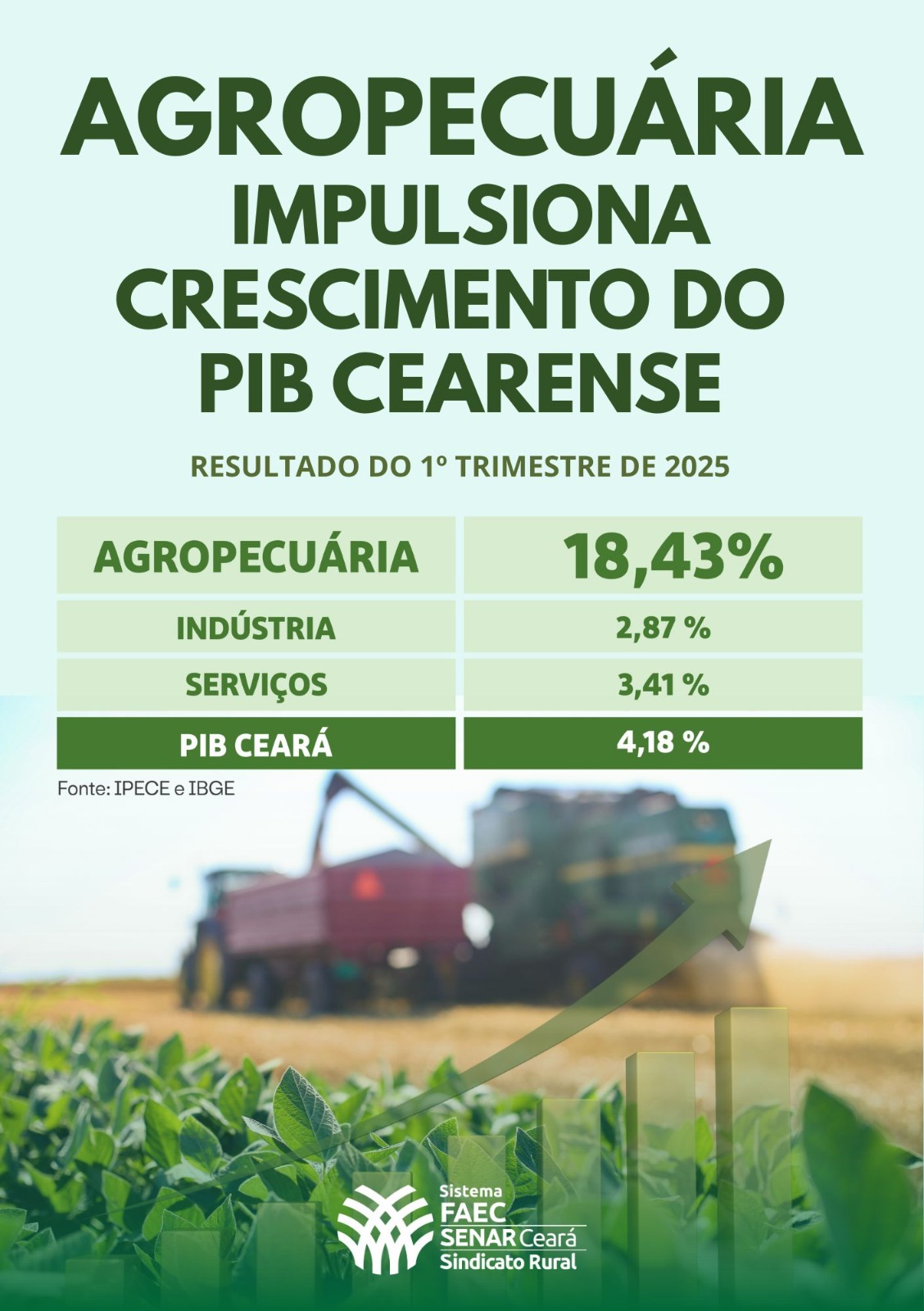 Destaque da economia cearense, o setor agropecuário registrou expressivo crescimento 18,43% no primeiro trimestre de 2025 em relação ao mesmo período de 2024, superando o desempenho dos setores de Serviços (+3,41%) e da Indústria (+2,87%). No período, o Produto Interno Bruto (PIB) do Ceará registrou alta de 4,18%. Os dados foram divulgados nesta quarta-feira (25) pelo Instituto de Pesquisa e Estratégia Econômica do Ceará (Ipece).