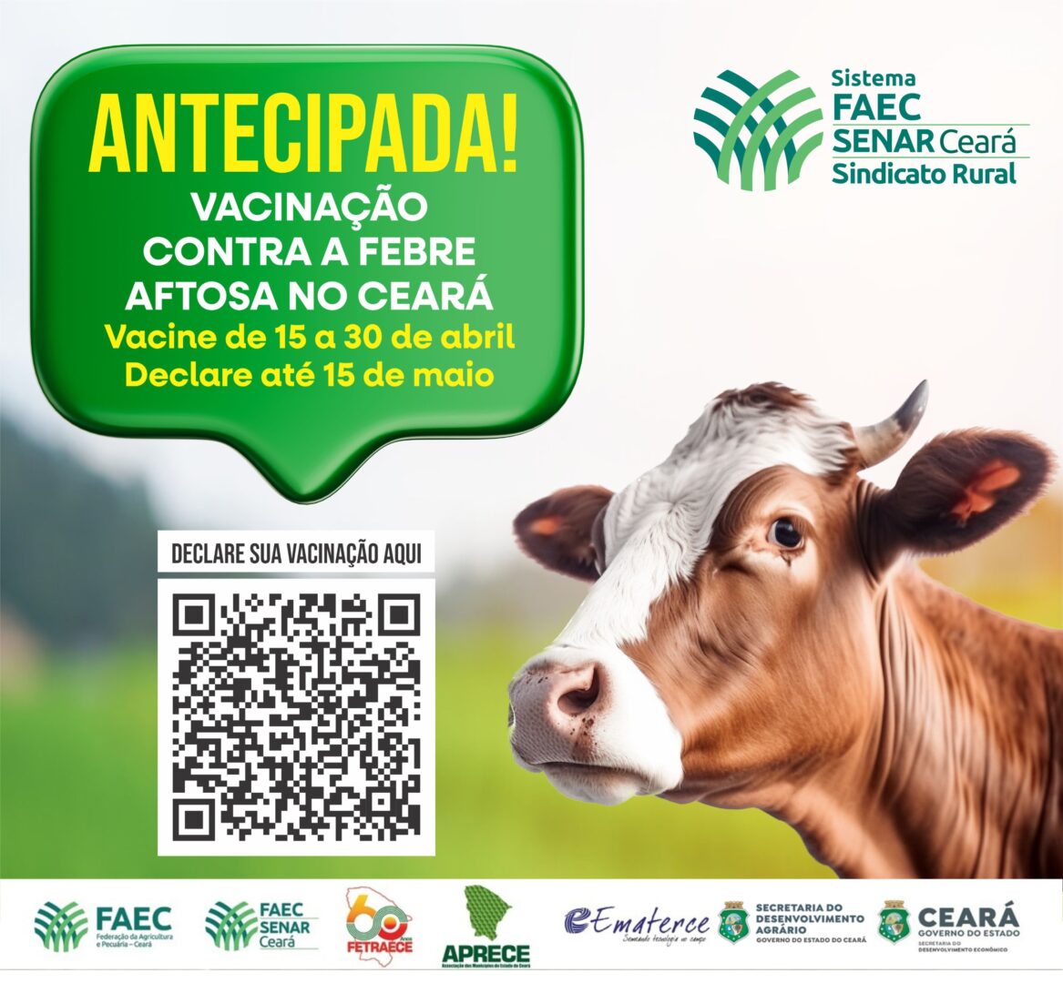A pedido da Federação da Agricultura e Pecuária do Estado do Ceará (Faec), a Adagri antecipou a vacinação contra febre aftosa para que seja realizada em uma única etapa, de forma emergencial. O período para o produtor comprar a vacina nas revendas autorizadas teve início nesta segunda-feira (15) e vai até o dia 30 de abril. E a declaração da vacinação junto à Agência de Defesa Agropecuária do Ceará (Adagri) deve ser feita até o dia 15 de maio.
