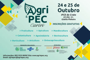 Estão abertas as inscrições para o Agri&Pec Cariri, evento que será realizado na sede do Campus do Instituto Federal de Educação do Crato, nos dias 24 e 25 de outubro próximos.  As inscrições são gratuitas e podem ser feitas pelo site do IFCE, que convidou a Federação da Agricultura e Pecuária do Estado do Ceará (FAEC), o Serviço Nacional de Aprendizagem Rural – SENAR-CE e o Sebrae-CE , par realizarem em conjunto o evento, dada a expertise do Sistema no Seminário Nordestino de Pecuária-PecNordeste.