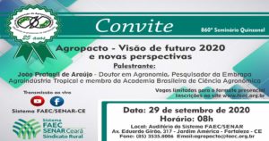 Depois de alguns meses com as reuniões presenciais suspensas, devido a pandemia do coronavírus e o afastamento social recomendado pelas autoridades sanitárias, a Federação da Agricultura e Pecuária do Estado do Ceará – FAEC, retoma na próxima terça- feira, dia 29 de setembro , a partir das 8 horas, o encontro quinzenal do Pacto de Cooperação da Agropecuária Cearense- AGROPACTO.