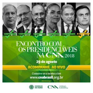 A Confederação da Agricultura e Pecuária do Brasil (CNA) e o Conselho do Agro, que reúne as entidades do setor agropecuário, realizam, no dia 29 de agosto (quarta-feira), um encontro com os candidatos à presidência da República, na sede da entidade, em Brasília.