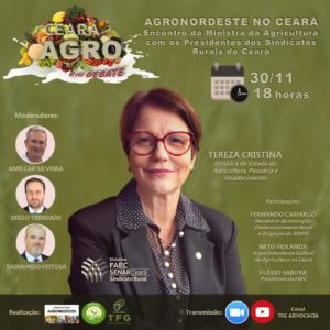 A live será realizada dia 1, às 18hrs e contará com a participação especial da ministra do Mapa, Tereza Cristina, do Presidente da FAEC, Flávio Saboya, os presidentes dos sindicatos rurais, o Superintendente Federal da Agricultura, Neto Holanda e do Secretário de Inovação e Desenvolvimento Rural do Mapa, Fernando Camargo.
