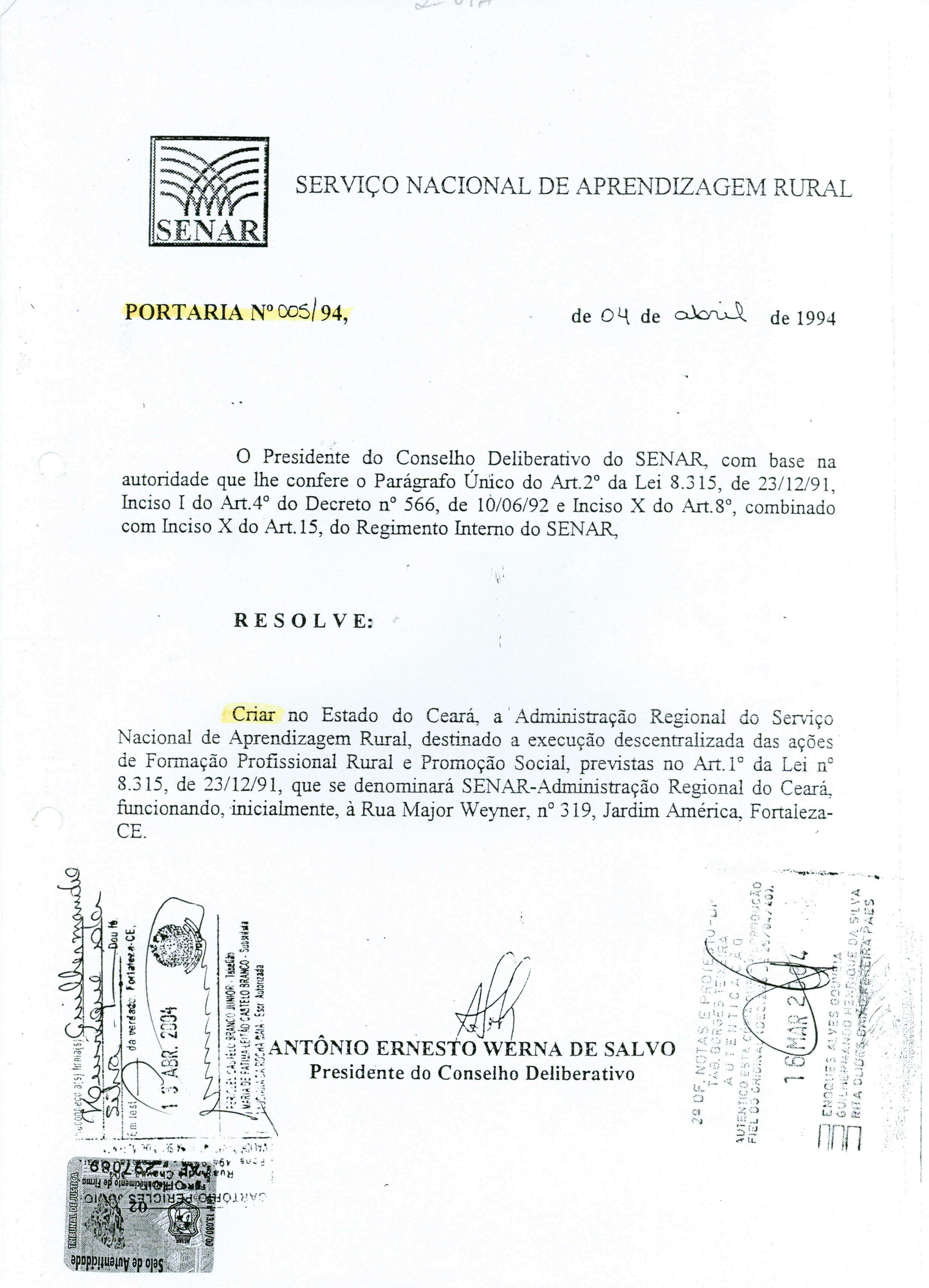 | Portaria nº 005/1994 – Cria o SENAR-AR/CE | |