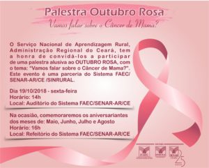 No Dia Internacional de Combate ao Câncer de Mama, 19 de outubro, a Federação da Agricultura e Pecuária do Estado do Ceará – FAEC e o Serviço Nacional de Aprendizagem Rural – SENAR AR/CE e SINRUAL realiza no auditório da sede do Sistema FAEC/SENAR/SINRUAL, a palestra “Vamos falar sobre o câncer de mama”? O evento acontece como parte do calendário das entidades na perspectiva de fortalecer o trabalho de conscientização para a prevenção e cuidados que homens e mulheres devem ter com relação a doença.