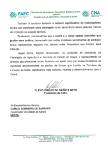 A propósito da posição de alguns, manifestada abertamente nas redes sociais, informando  que os representantes do setor agropecuário cearense não se posicionaram  sobre a lei de proibição da pulverização aérea no Estado do Ceará, o  Presidente da Federação da Agricultura e Pecuária do Estado do Ceará, Flávio Saboya,  lembra que a Federação manifestou-se  oficialmente e publicamente  sobre o assunto junto ao Governador do Estado e à Assembleia Legislativa, em 2019, antes e depois da aprovação da Lei 16.820/2019 . Disse ainda, que a moção recebeu  o apoio de outras instituições como  a Associação dos Engenheiros Agrônomos,  a  Academia Cearense de Ciências e o Conselho Regional de Engenharia , atestando tecnicamente, com base em estudos  que a pulverização aérea não traz prejuízos as abelhas, como destacada no projeto de lei apresentado.