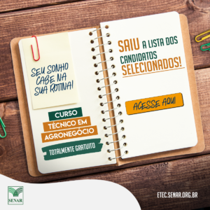 Brasília (20/02/2019) – O Serviço Nacional de Aprendizagem Rural (Senar) divulga nesta quarta (20) a lista de candidatos selecionados para a etapa classificatória do curso Técnico em Agronegócio.